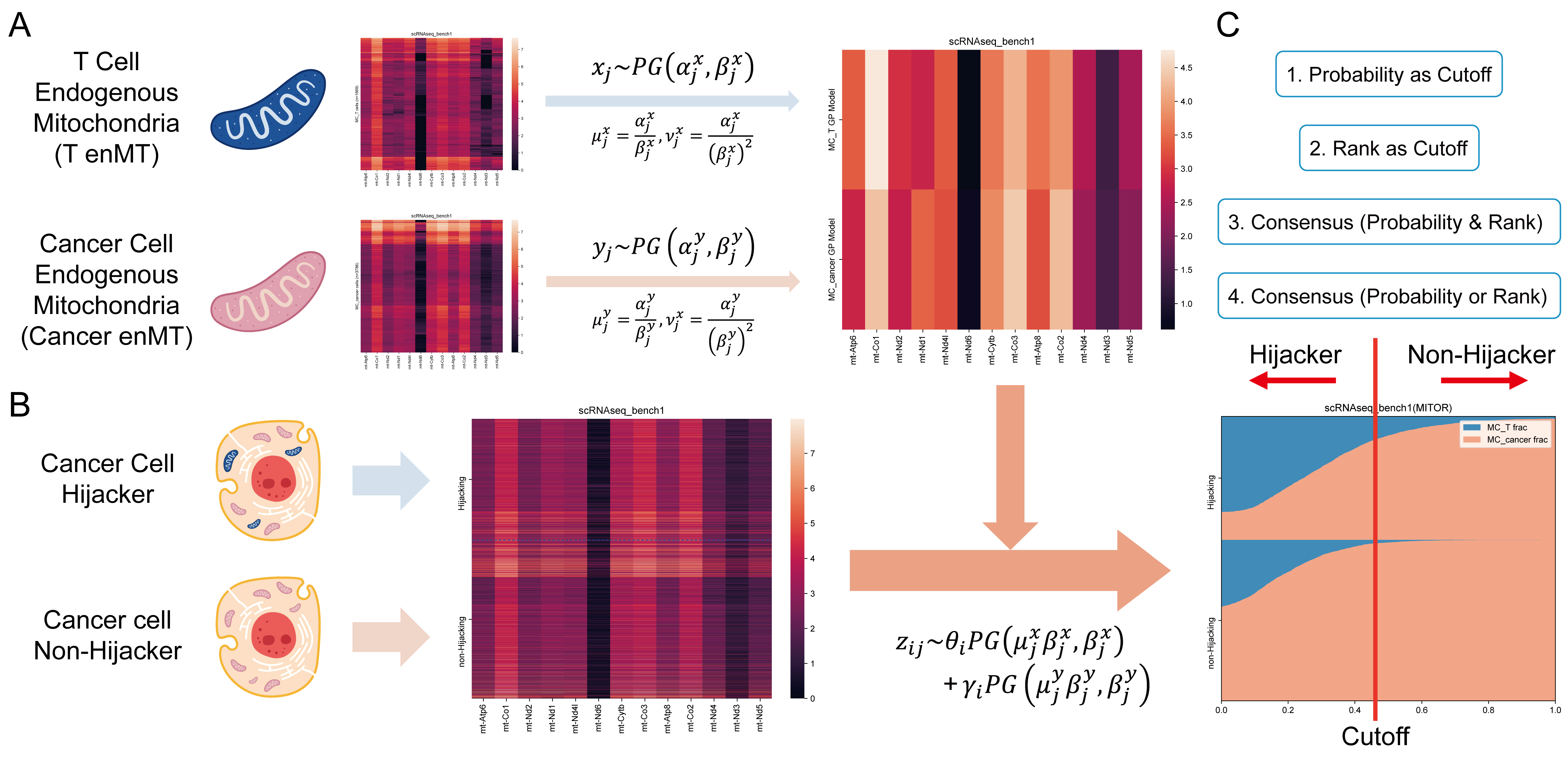 - Abstract: T cells play a crucial role in the immune system by identifying and eliminating tumor cells. Malignant cancer cells can hijack mitochondria (MT) from nearby T cells, affecting their metabolism and weakening their immune functions. This phenomenon, observed through co-culture systems and fluorescent labeling, has been further explored with the development of the MERCI algorithm, which predicts T cell MT hijacking in cancer cells using single-cell RNA (scRNA) sequencing data. However, MERCI is limited by its reliance on a linear model and its inability to handle data sparsity. To address these challenges, we introduce MitoR, a computational algorithm using a Poisson–Gamma mixture model to predict T cell MT hijacking from tumor scRNA data. In performance comparisons, MitoR demonstrated improved performance compared to MERCI’s on gold-standard benchmark datasets scRNA-bench1 (top AUROC: 0.761, top accuracy: 0.769) and scRNA-bench2 (top AUROC: 0.730, top accuracy: 0.733). Additionally, MitoR showed an average 4.14% increase in AUROC and an average 3.86% increase in accuracy over MERCI in all rank strategies and simulated datasets. Finally, MitoR revealed T cell MT hijacking events in two real-world tumor datasets (basal cell carcinoma and esophageal squamous-cell carcinoma), highlighting their role in tumor immune evasion.